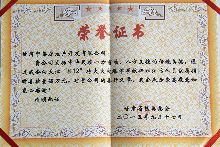 2015年8月12日23時(shí)30分,天津?yàn)I海新區(qū)國(guó)際物流中心發(fā)生重大爆炸火災(zāi)事故,造成重大人員傷亡。甘肅中集房地產(chǎn)開發(fā)有限公司總經(jīng)理周啟濤獲悉后,決定為在本次事故中犧牲的消防官兵及其家屬捐款100萬元,用于幫助犧牲消防官兵家屬善后事宜的處理,以盡一份甘肅企業(yè)的慈善愛心。