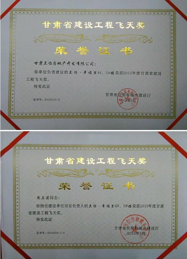 2016年2月5日,由甘肅省住房和城鄉(xiāng)建設(shè)廳評選的2015年度甘肅省建設(shè)工程“飛天獎”對社會各界發(fā)布,本次共發(fā)布41個“飛天獎”項目。其中,由甘肅中集實業(yè)集團子公司甘肅蘭怡房地產(chǎn)開發(fā)有限公司開發(fā)建設(shè)的中集·幸福里憑借高品質(zhì)的開發(fā)標準,喜獲甘肅省2015年度建設(shè)工程“飛天獎”榮譽稱號,成為蘭州市安寧區(qū)唯一獲此殊榮的項目。