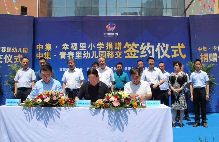 2017年6月22日下午14時(shí),甘肅中集實(shí)業(yè)集團(tuán)有限公司通過甘肅省慈善總會(huì),向蘭州市安寧區(qū)人民政府捐贈(zèng)價(jià)值1.02億元中集•幸福里小學(xué)暨中集•青春里配建幼兒園移交儀式在中集•幸福里小學(xué)操場隆重舉行。甘肅省原人大常委會(huì)副主任、甘肅省慈善總會(huì)會(huì)長朱志良,甘肅省原民政廳黨組書記、廳長、甘肅省慈善總會(huì)常務(wù)副會(huì)長梁國安,甘肅省教育廳副廳長趙 凱,蘭州市人大常委會(huì)副主任孫曉鋼,蘭州市人民政府副秘書長淡漢榮,安寧區(qū)區(qū)委書記王 方及安寧區(qū)區(qū)委副書記、區(qū)長雒澤民攜安寧區(qū)委、區(qū)人大、區(qū)政府、區(qū)政協(xié)四大班子領(lǐng)導(dǎo),蘭州市教育局、蘭州市國土局、蘭州市規(guī)劃局、蘭州市房產(chǎn)局相關(guān)領(lǐng)導(dǎo)出席捐贈(zèng)儀式,甘肅中集實(shí)業(yè)集團(tuán)有限公司黨委書記、董事長周啟濤代表公司完成與安寧區(qū)人民政府捐贈(zèng)及移交簽約。